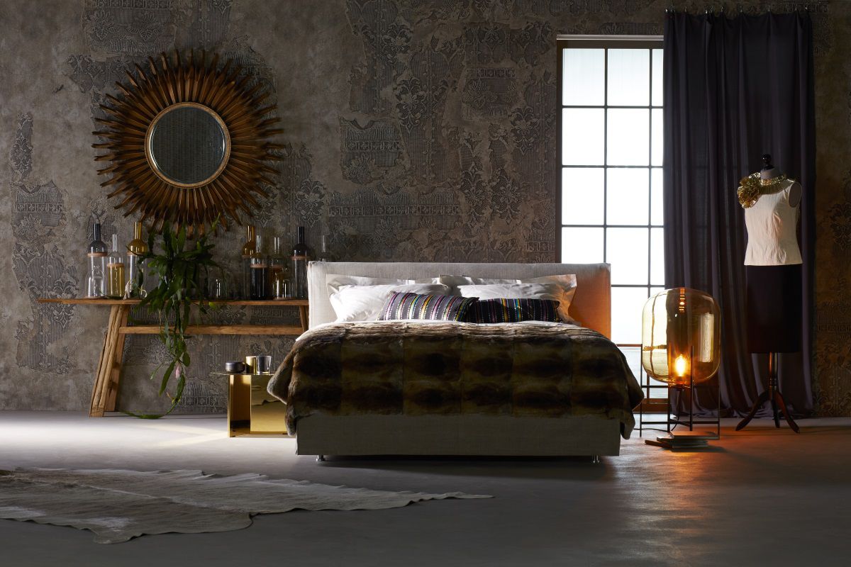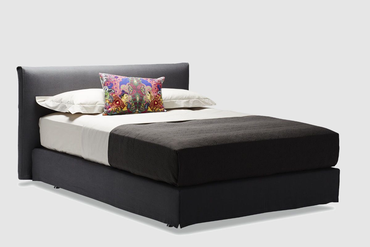 Bettgestell mit integrierter Untermatratze, passender Kopfteil bezogen aus unserer Stoff Auswahl #1. Im Geschäft wählbar.