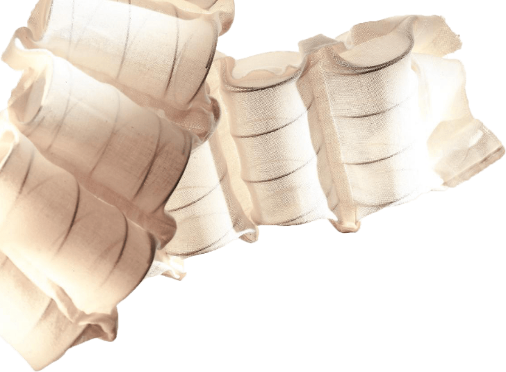 Das aus Baumwolle gefertigte Taschenfederkerngewebe unterstützt hervorragend den Abtransport der Körperfeuchtigkeit aus der Matratze heraus und gewährleistet beste Luftzirkulation. Längs in der SCHRAMM-Matratze integriert, ermöglichen die Federn einen optimalen Druckausgleich beim Liegen. Die Kombination unterschiedlicher Federstärken erzeugt einen fließenden Kraftverlauf und gibt uns die Möglichkeit, bis zu fünf verschiedene Festigkeiten zu kreieren.