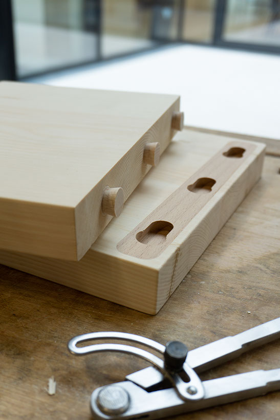 Die Betten werden komplett aus Massivholz und ohne Schrauben bzw. Metallteile gefertigt. Nach außen hin dezent minimalistisch, offenbart sich das durchdachte Design erst in den Details: