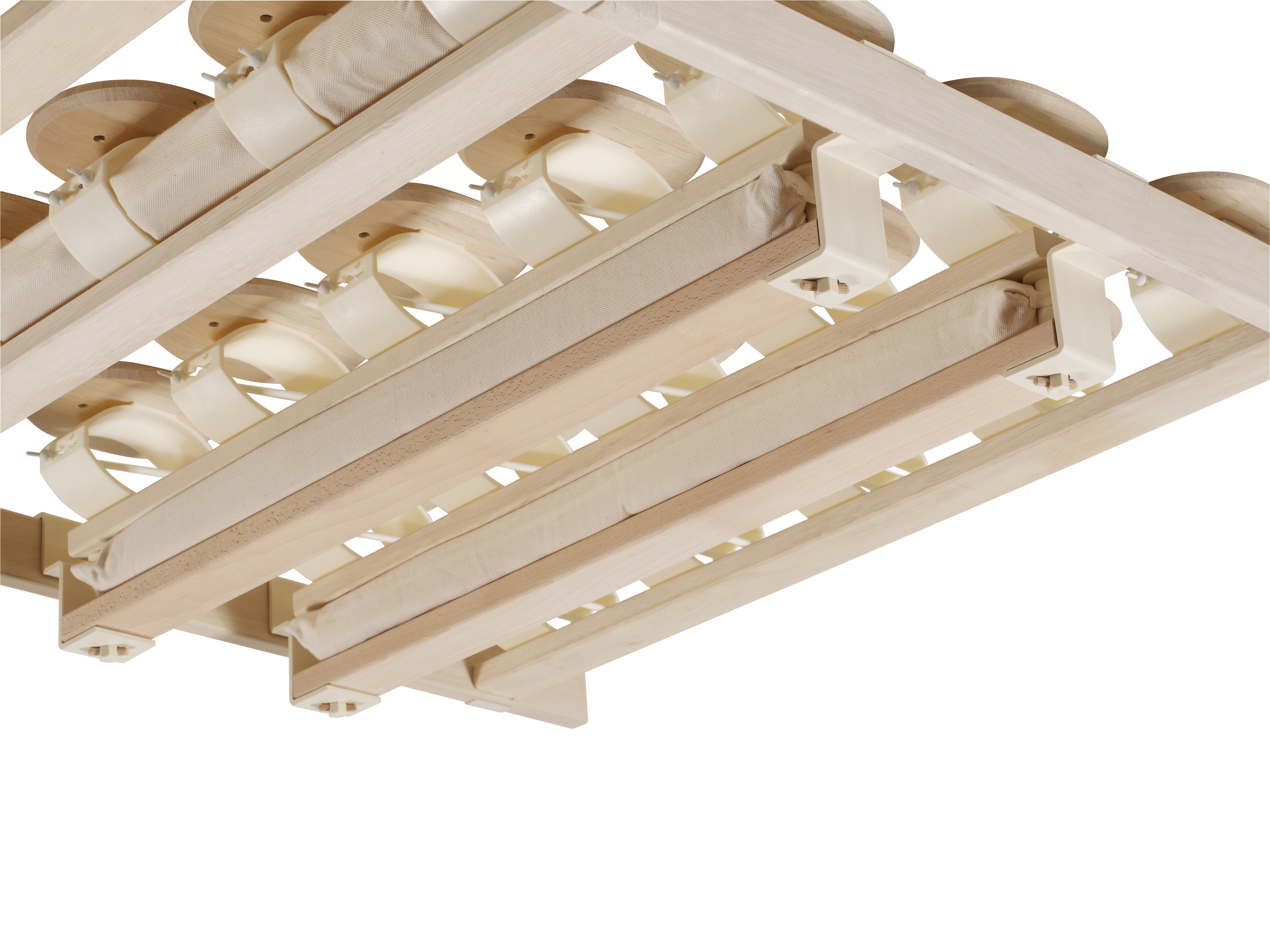 Durch die Spezialfederkörper können Sie Ihr Bett mit den angeordneten Zugstangen nach Ihren persönlichen Bedürfnissen einstellen. Spezielle Schulter- und Beckenentlastung erreichen Sie mit wenigen Handgriffen durch herausnehmen oder spannen der Zugstangen, die in der Mitte der Spezialfederkörper angebracht sind. Dieses Bettsystem passt in jedes bestehende Bett mit seitlichen Auflageleisten, am besten natürlich in unsere metallfreien Relax Massivholzbetten.